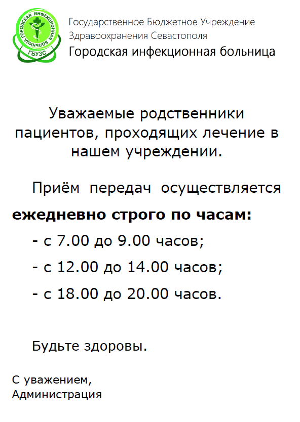 | Оленченко Анатолий Анатольевич главный врач ГБУЗС «Городская инфекционная больница» | Среда с 16.00 до 18.00 часов | г. Севастополь, ул. Коммунистическая, 40, административное здание, кабинет главного врача | +7 (8692) 55-28-44 секретарь |